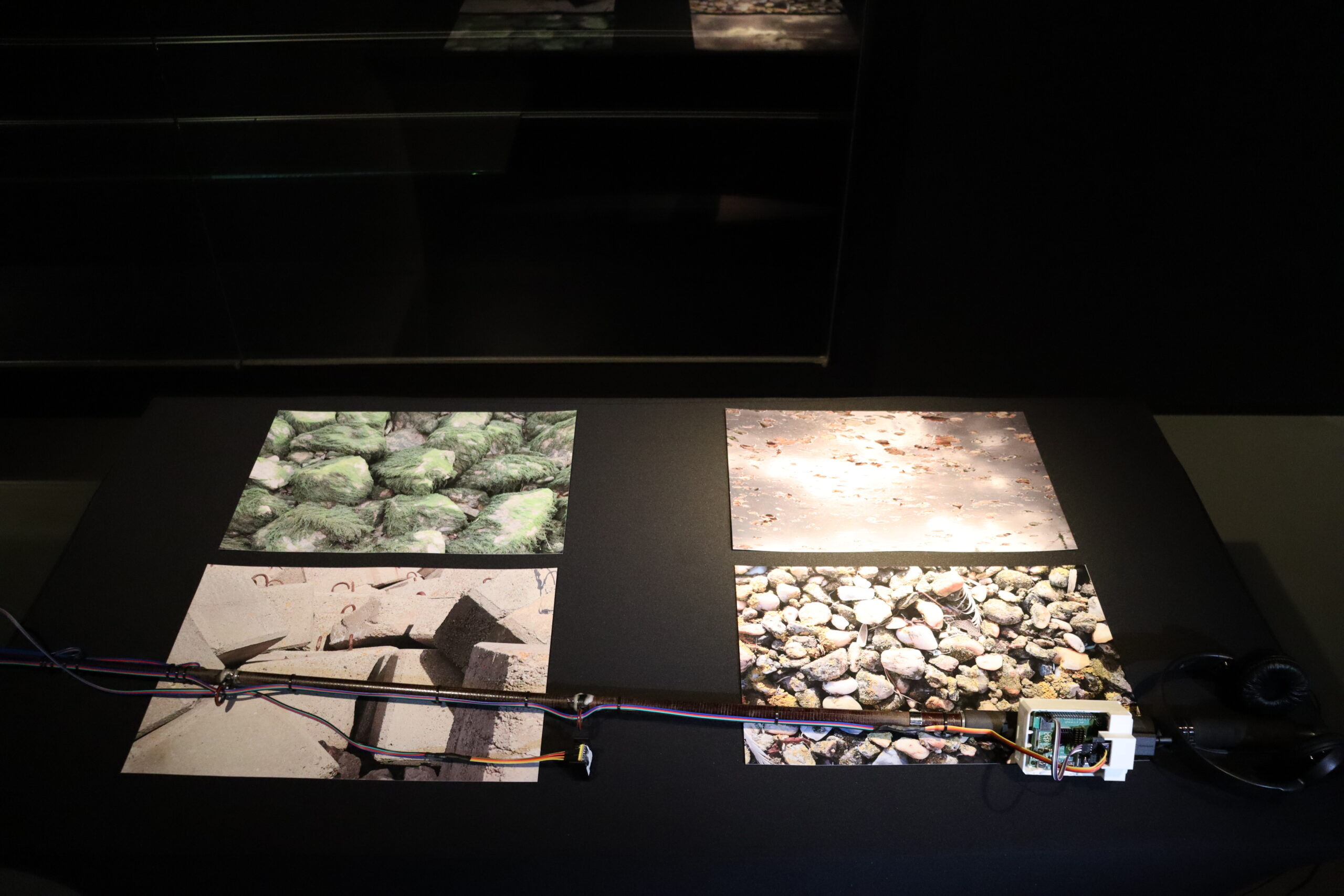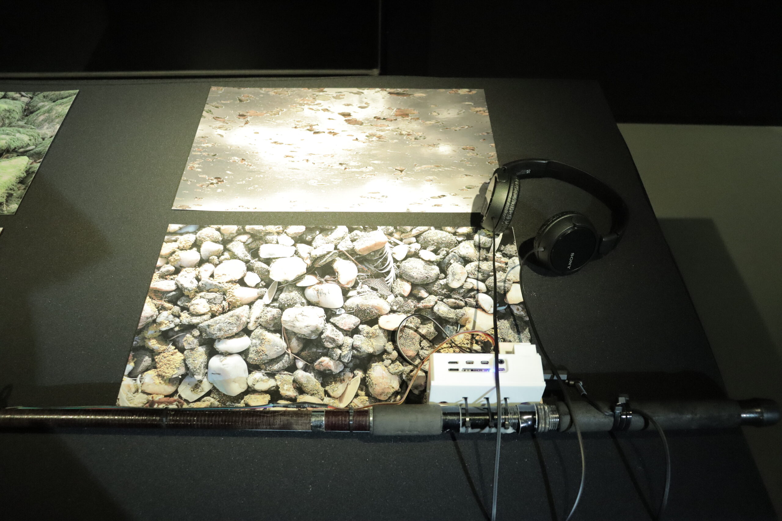 Medios: Caña de pescar modificada con sensor de movimiento, sensor de color, Raspberry Pi, sistema de audio, mapeo frecuencia-color en tiempo real y auriculares.