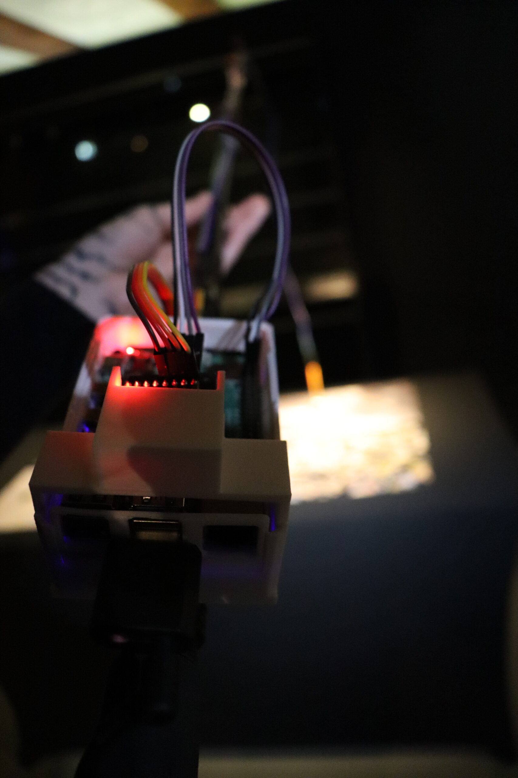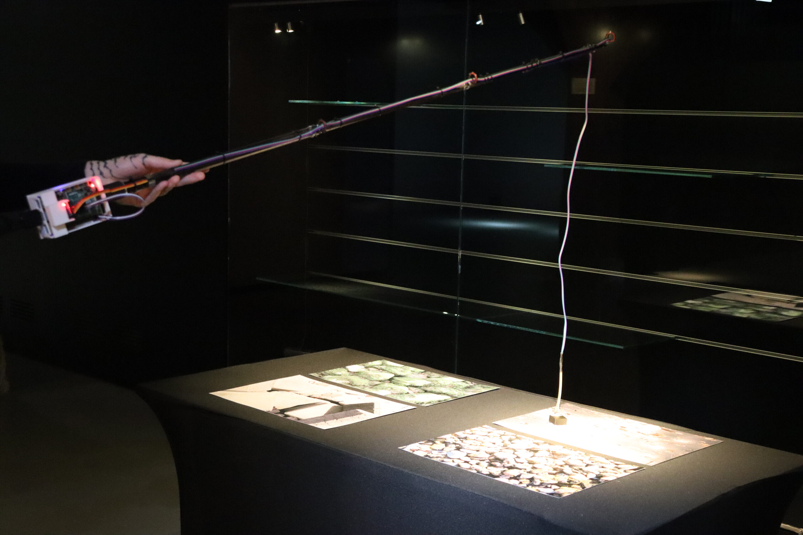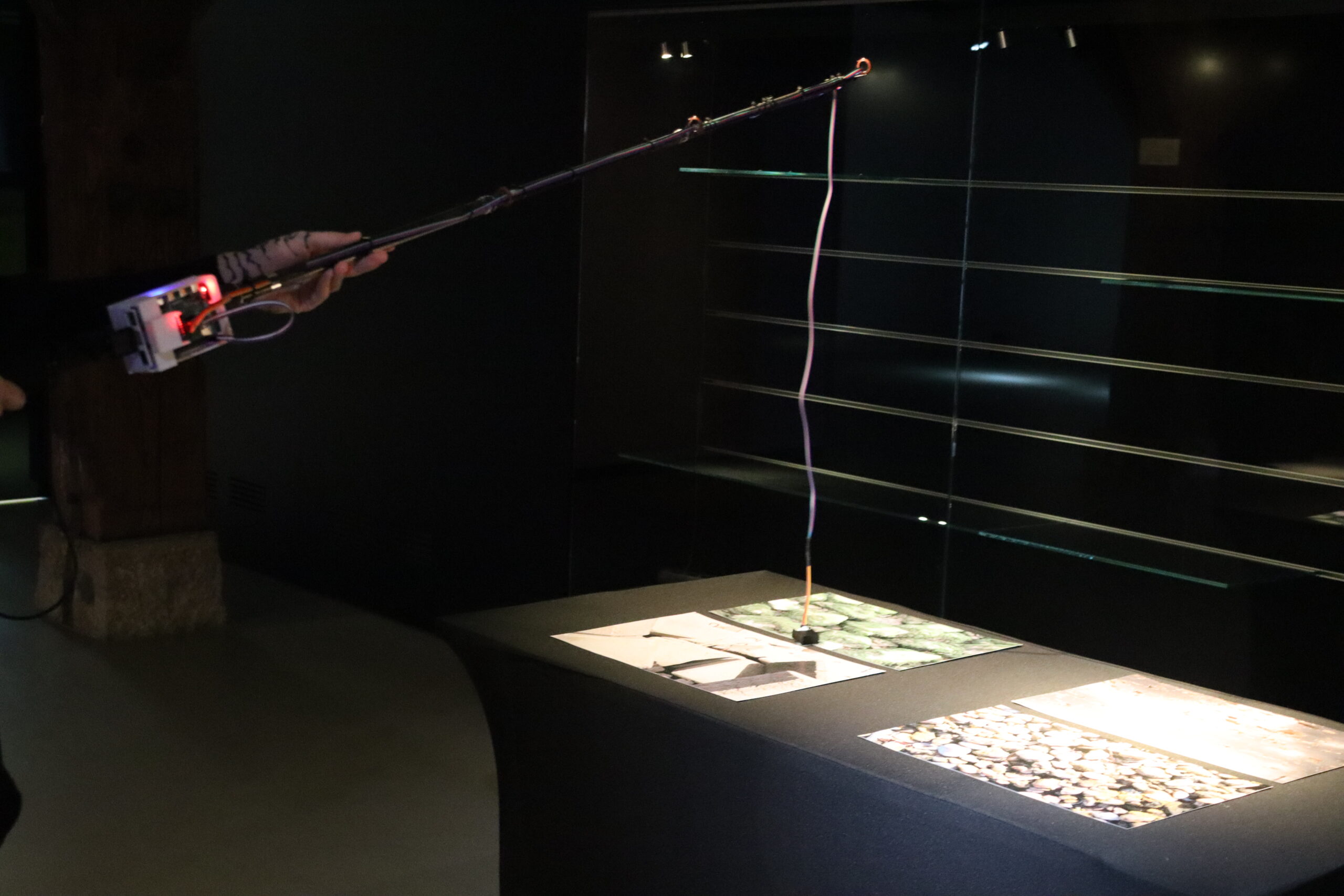 Medien: Modifizierte Angelrute mit Bewegungssensor, Farbsensor, Raspberry Pi, Audiosystem, Echtzeit-Frequenz-Farb-Mapping und Kopfhörer.