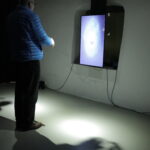 This space transforms gesture into a fleeting score. The movement of the hands writes upon a field of synthetic sound while simultaneously prompting an AI model to generate images. Each gesture shapes the acoustic texture and paints with algorithmic light, creating an audiovisual choreography in which memory is not represented but performed through the body.