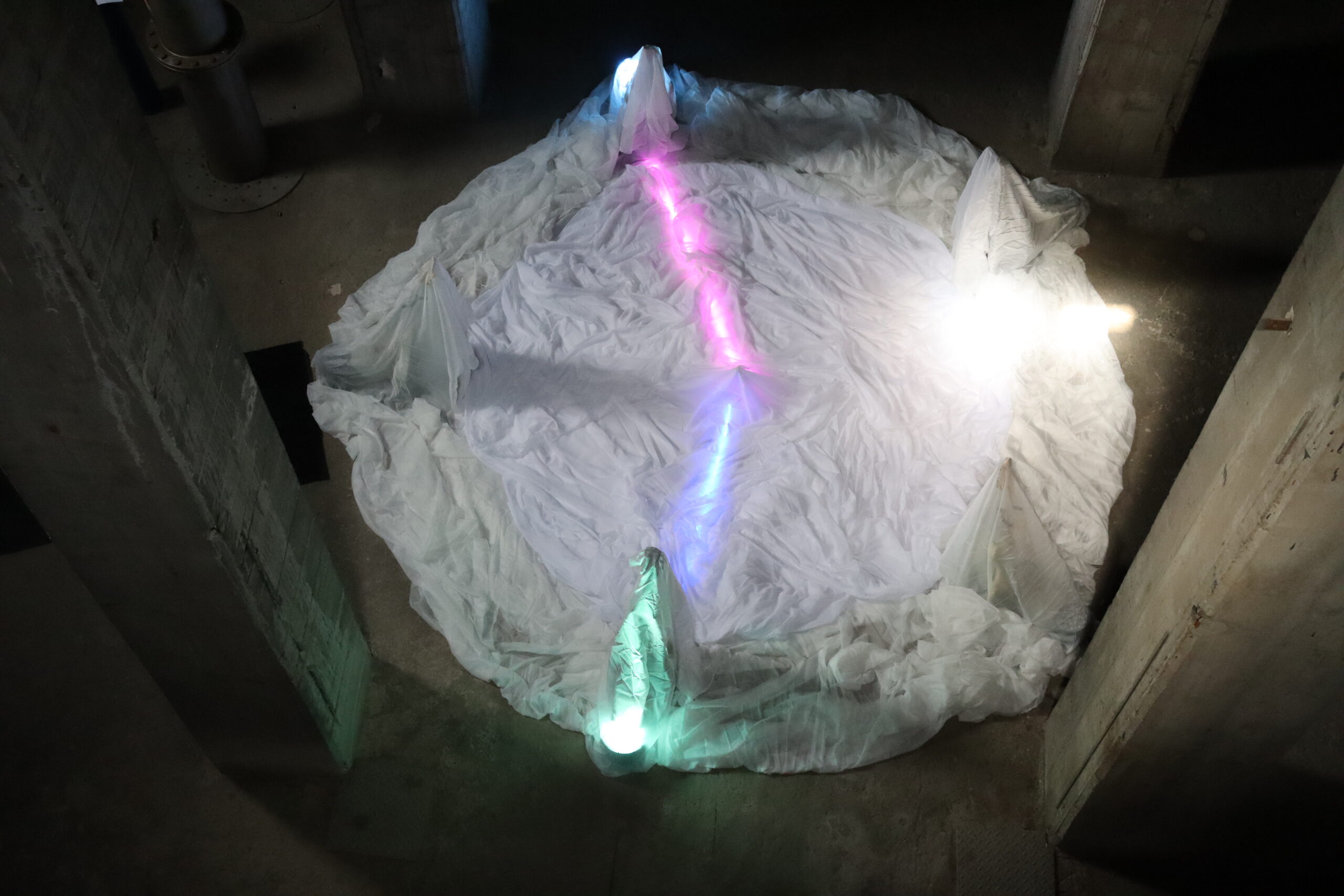 In der Stille führt die Installation einen introvertierten Dialog—ein Flüstern zwischen Struktur und Erinnerung. Wenn Besucher:innen eintreten, „hört“ die Installation deren Schritte, Stimmen und Murmeln und formt daraus ihre Klangwelt.