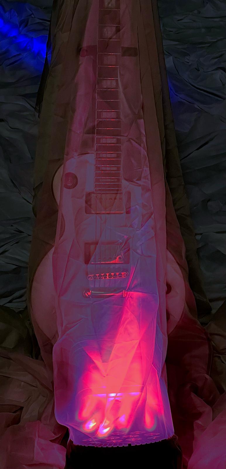 for Five electric guitars, feedback systems, AI algorithm, one microphone, five loudspeakers, five DMX lights, live electronics, live light installation